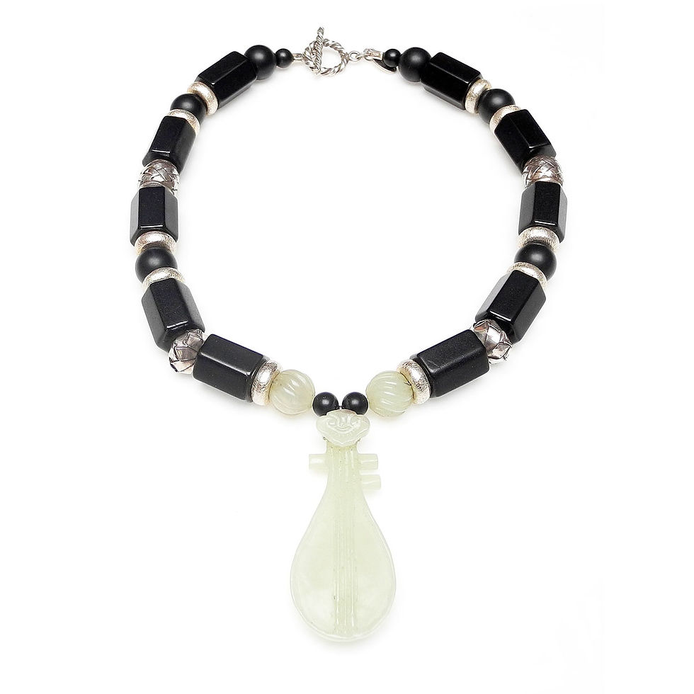 Dramatic Black & White Necklace with Jade Guitar Pendant, Jet & Silver